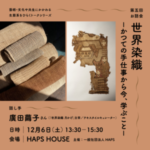 - 【藝術・文化や共生にかかわる生態系をひらくトークシリーズ】第五回 お話会「世界染織 ーかつての手仕事からいま、学ぶこと」開催のお知らせ