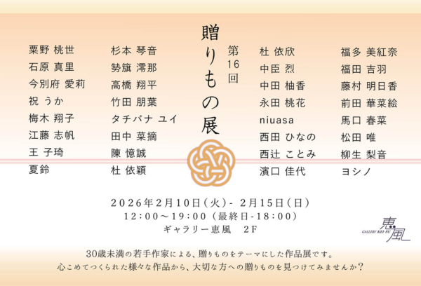 今展は、30歳未満の若手アーティスト32名による贈りものをテーマにした作品展です。16回目を迎える恒例のこの企画展は、小品ながら若々しくエネルギー溢れた作品が並び、楽しみにしてご来場者くださる方も増えました。初めて発表する現役の学生や、創作活動を続けている若手作家など経験は様々です。心を込めてつくられた32名のバラエティー豊かな作品を是非お楽しみください。みなさまの温かいエールをお願い申し上げます。(野村)