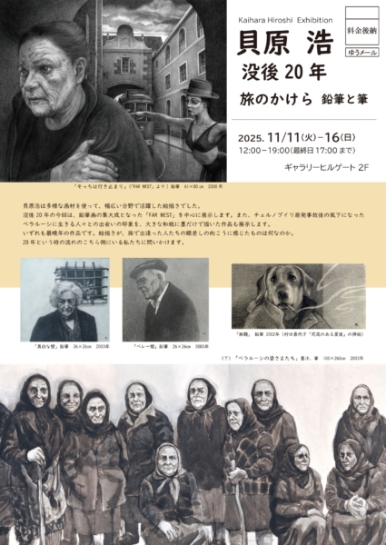 没後20年の今回は、鉛筆画の集大成となった「FAR WEST」を中心に展示します。 また、チェルノブイリ原発事故後の風下になったベラルーシに生きる人々との出会いの印象を、大きな和紙に墨だけで描いた作品も展示します。