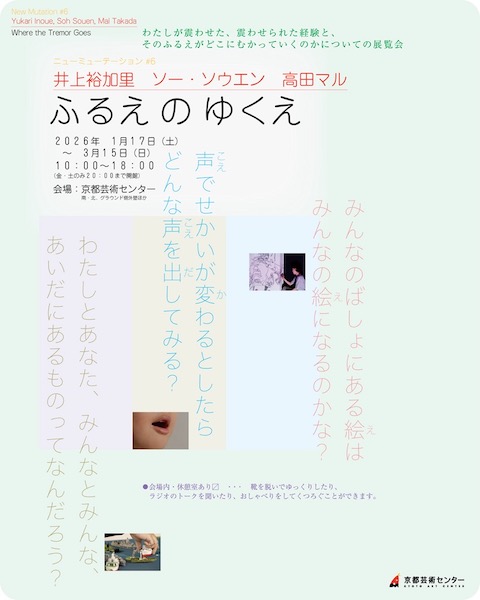 京都芸術センターでは、関西ゆかりの若手作家を支援する枠組みである「ニューミューテーション」第6弾として、井上裕加里、ソー・ソウエン、高田マルによる展覧会を開催します。