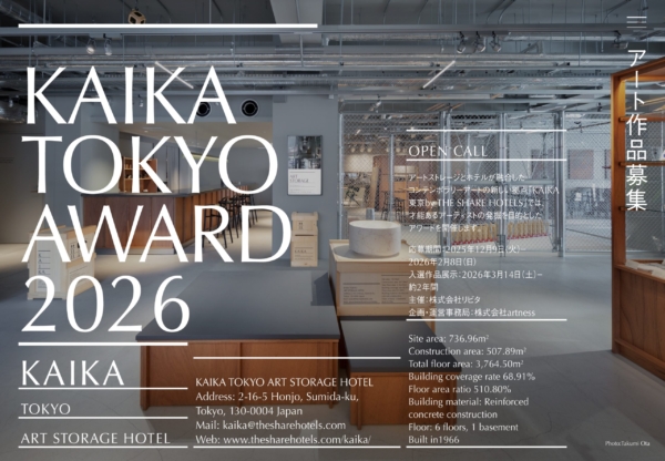 「KAIKA 東京 by THE SHARE HOTELS」では、才能あるアーティストの発掘を目的として、幅広いジャンルの作品を募集します。入選作品は本施設にて約2年間収蔵展示され、訪れる国内外のゲストが鑑賞します。優れた作品とともに施設のコンテクストを活かした展示プランをお待ちしています。