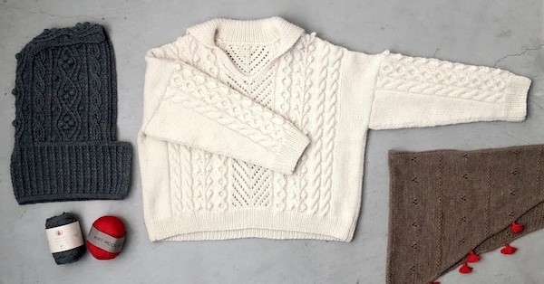 毎年恒例、生活館での「ちっちゃい編み物展」は、編み上がりのサンプルを展示しながら、普段は置けないボリュームの毛糸を見ていただける特別なフェア。今回も、新しく発売された「DARUMA PATTERN BOOK 10」の完成品の一部を展示、必要毛糸を販売します。