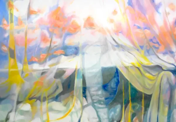 バレエダンサーとしての経歴と、二重の文化的アイデンティティのあいだで生きる経験を元に、太田は可動式の舞台装置(書割)と重なった布の層を用いて、視覚的な風景が絶えず変化するインスタレーションを制作します。