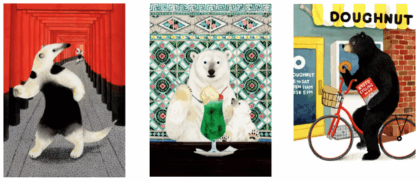 擬人化された動物が本を読んでいる様子が愛らしく、海外からの旅行者にも選ばれています。「動物の形、骨格、毛並み、すべてが美しい。それらを見ているとシンプルに生命を感じる」と語る小林の新たなシリーズをこのたび本展で初公開します。「Stroll around Kyoto」では、京都を散歩しながら名所や銘菓を楽しんでいる動物たちの様子を生き生きと描いています。京都らしい店やモチーフは、京都 蔦屋書店のスタッフが推薦した場所や食べ物を参考に制作され、今回小林が取り組んだZINEの中でスケッチやMAPとなり紹介されています。12種類の作品は、すべて原画とジークレープリントにて販売、年の瀬に合わせてカレンダーもご用意しました。