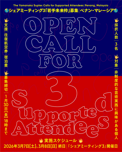 今回はそのような共同リサーチトリップの延長として、2023年から実施してきたオルタナティブな集まり「シェアミーティング」で培ってきた「若手未来枠」の考え方を掛け合わせ、マレーシア・ペナン島で2日間にわたって開催されるシェアミーティング3「地震、雷、火事、親父、病原菌から生まれ出る美術」[2026年3月7日、8日] に旅費・滞在費のサポートを受けながら参加できる「若手未来枠」の募集を行います。選出された方々には、往復航空券および現地宿泊費3泊4日分をサポートし、東・東南・南アジアで活動するインディペンデント・スペース、アーティスト・ラン・イニシアティブ、アーティスト・コレクティブらの集まりに、観客として同席することができます。この機会にぜひ応募を検討してみてください。